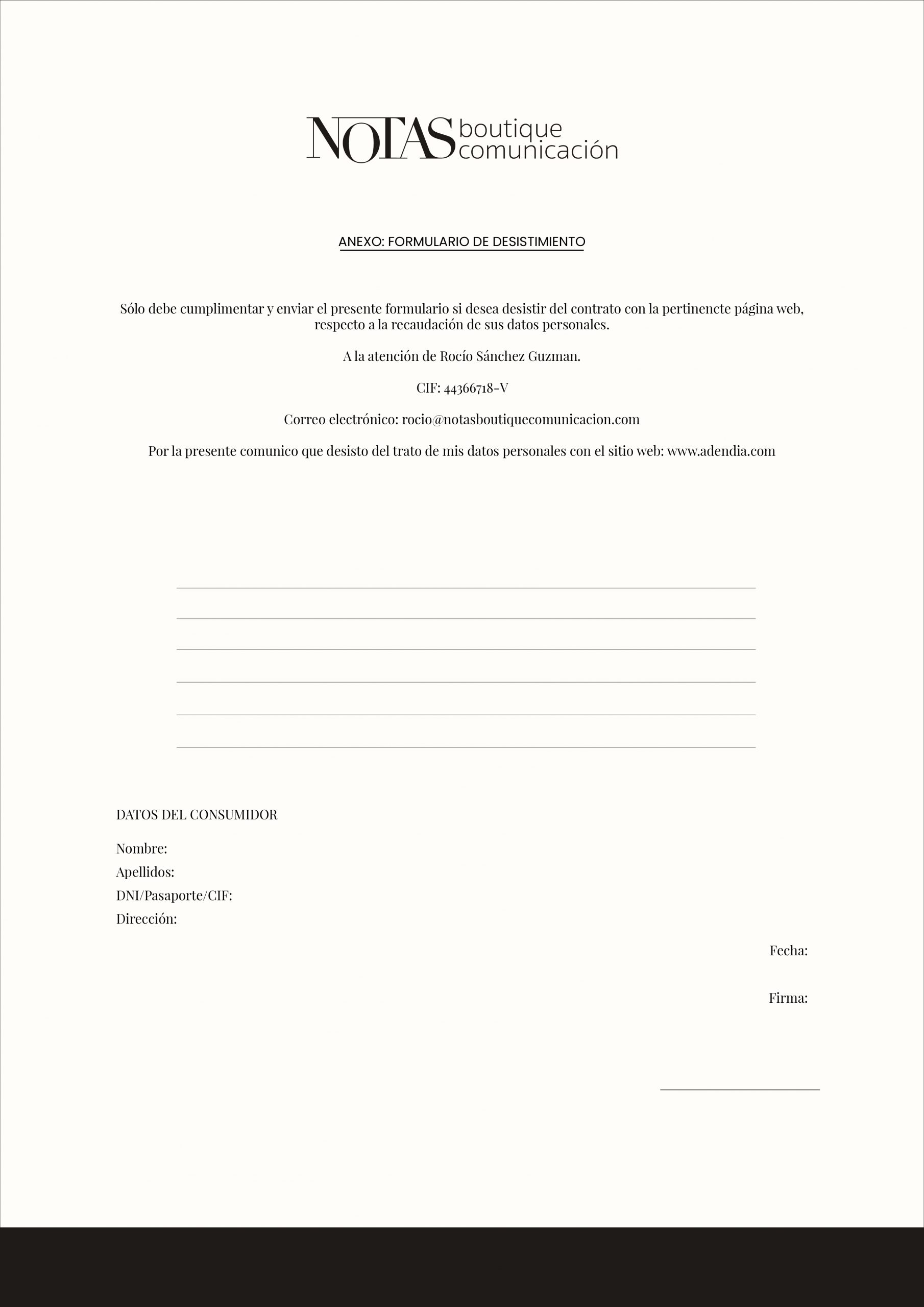 Sólo debe cumplimentar y enviar el presente formulario si desea desistir del Contrato. A la atención de NOTAS BOUTIQUE COMUNICACIÓN, Rocío Sánchez Guzmán, CIF: 44366718-V, Correo electrónico: rocio@notasboutiquecomunicacion.com