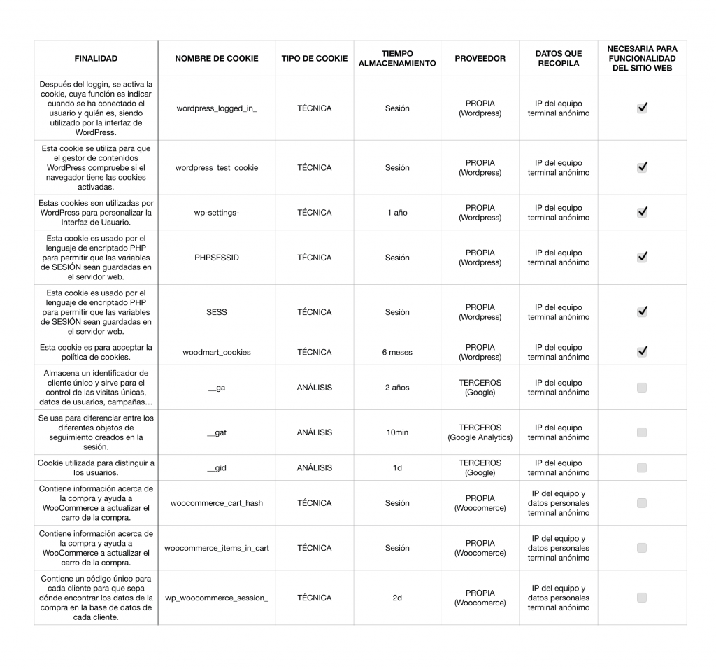 Finalidad de las Cookies utilizadas por el sitio web