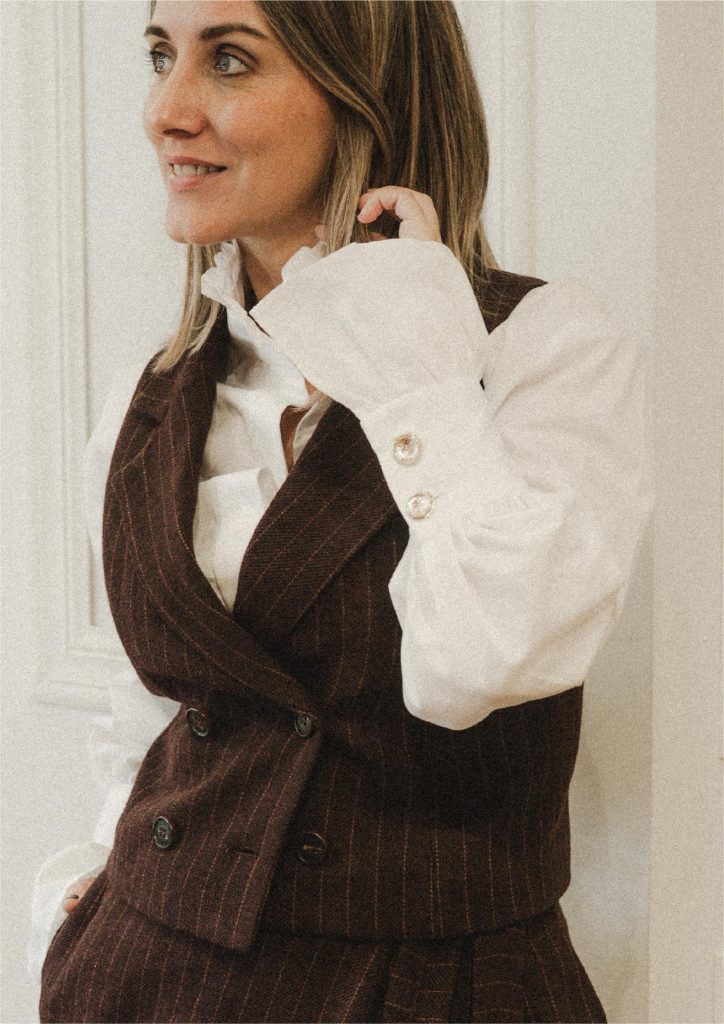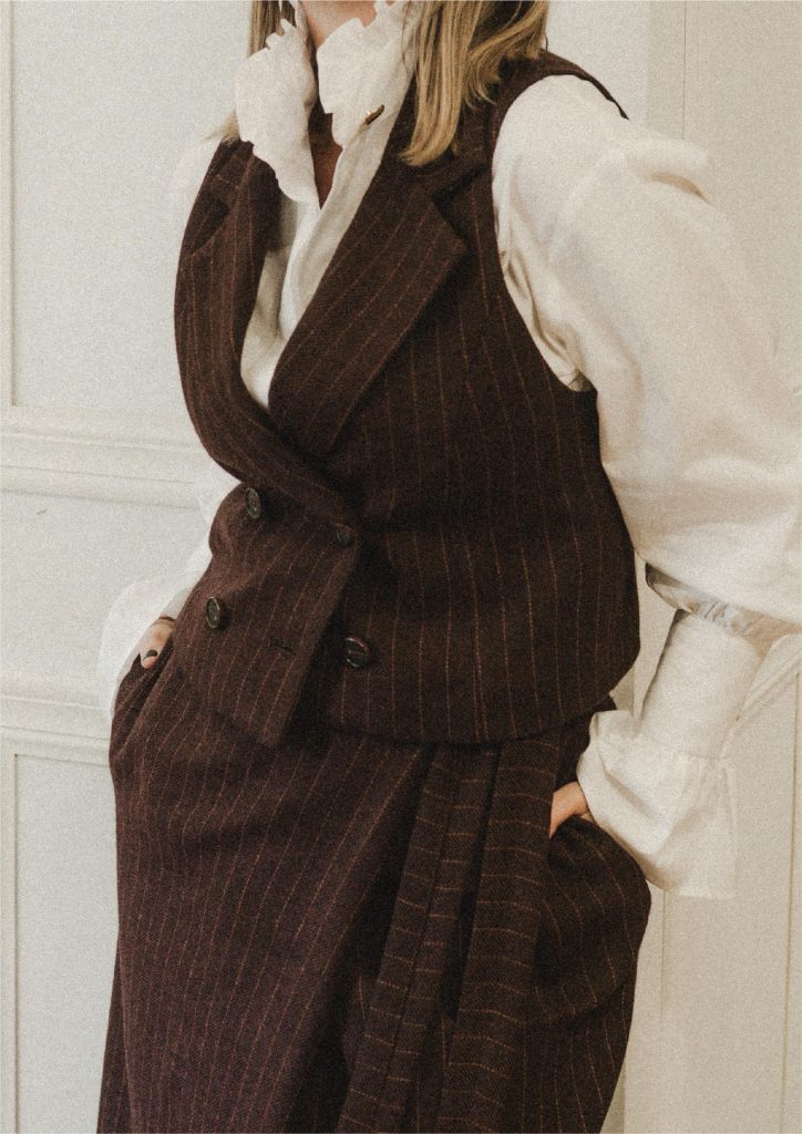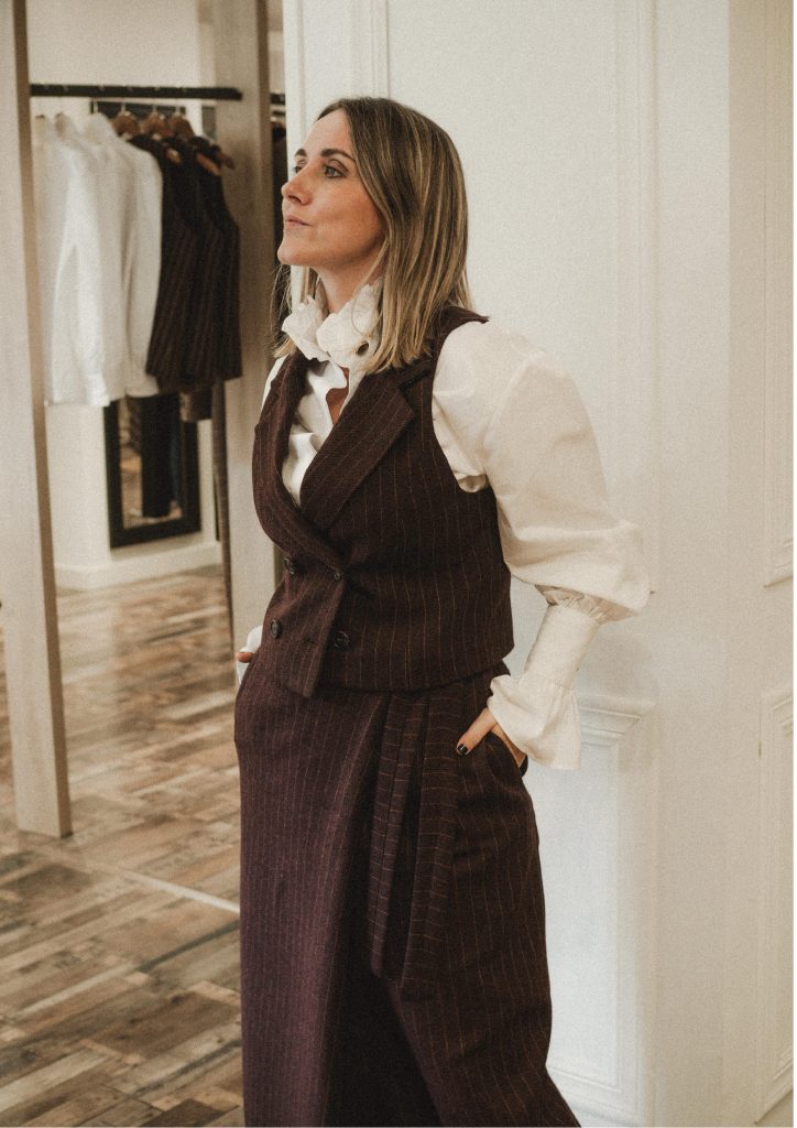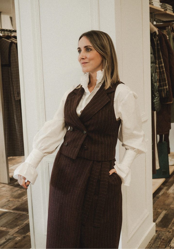 Opté por un set de lana con raya diplomática en tonos berenjena y caldera, compuesto por falda, americana y chaleco. Un conjunto elegante, cómodo y muy versátil, pensado para acompañar el ritmo real de una mujer actual.
