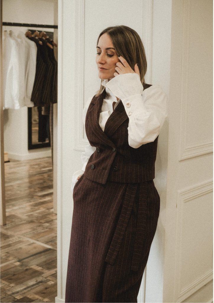 La falda, la americana y el chaleco permiten múltiples lecturas: más formales, más relajadas, más urbanas. Y eso, para mí, es clave. Prendas que no se quedan en un solo uso, sino que acompañan y evolucionan contigo.